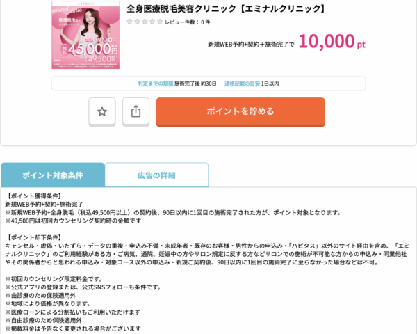 3️⃣ここでは例としてエミナルクリニックを選択して【ポイント獲得条件】をしっかり理解した後にポイントを貯めるをクリックしてエミナルクリニックのサイトから申し込みを行います。